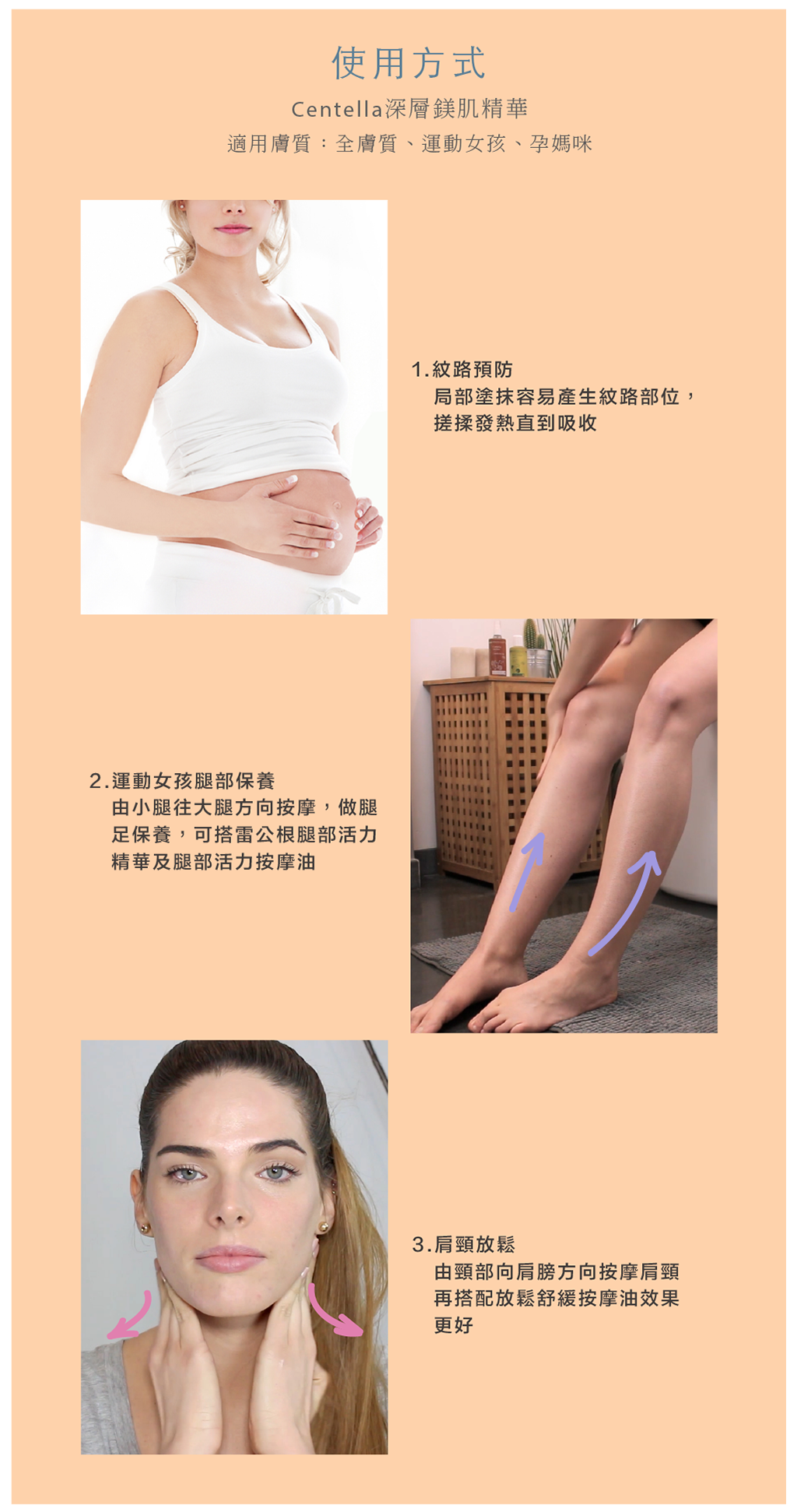 - 孕媽咪美體 - 先塗抹於身體肌膚,以保鮮膜包覆約20分鐘後,再用美體滋潤的產品護膚。