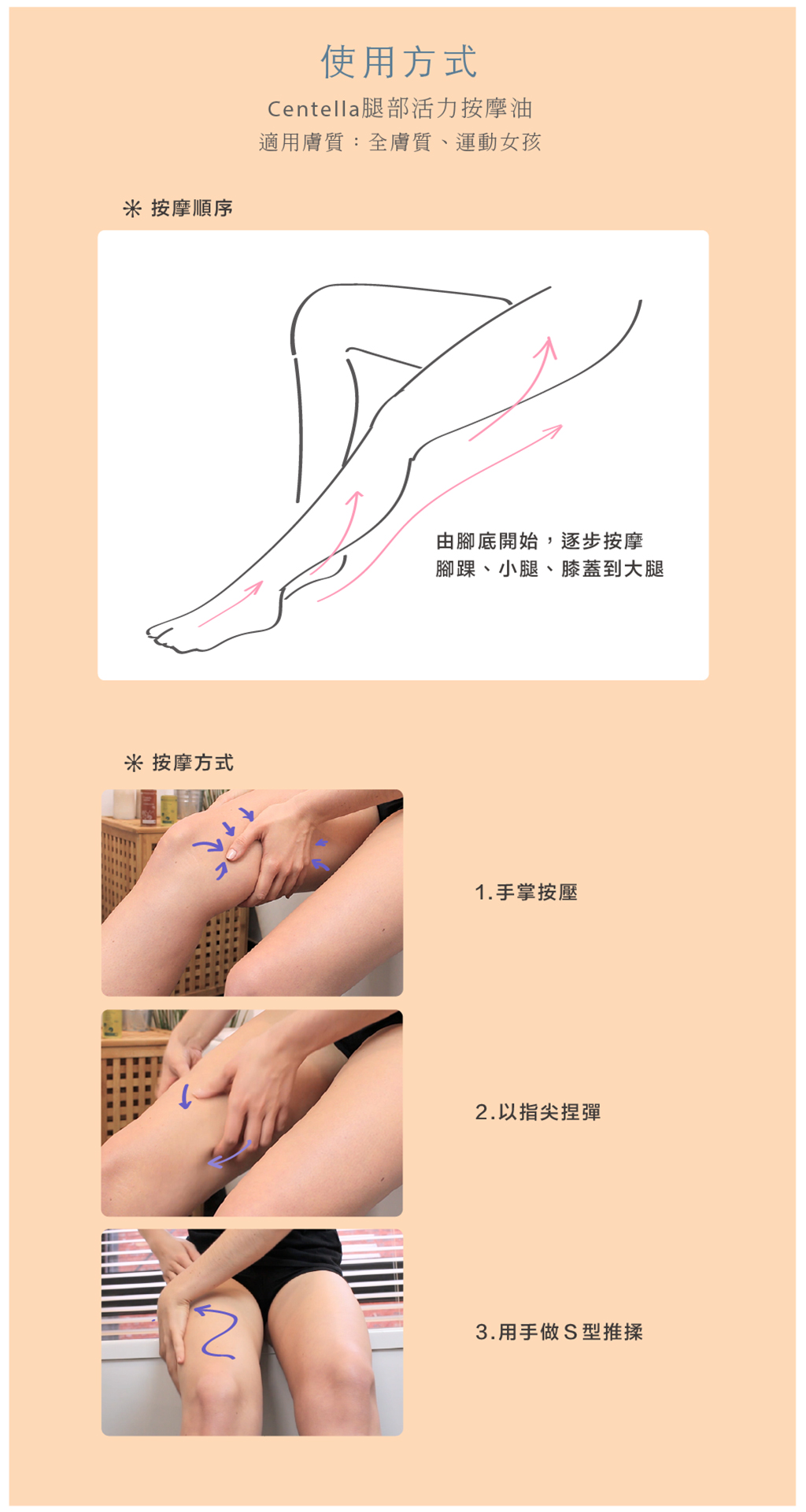 ▍用法:建議在沐浴後,取適量產品由左足向上慢慢按摩至大腿,別忘了細細搓揉膝蓋以及膝蓋內側肌膚,後再換右足及右腿,重複繞圈按摩的動作,讓雙腿肌膚更加細緻、有活力。