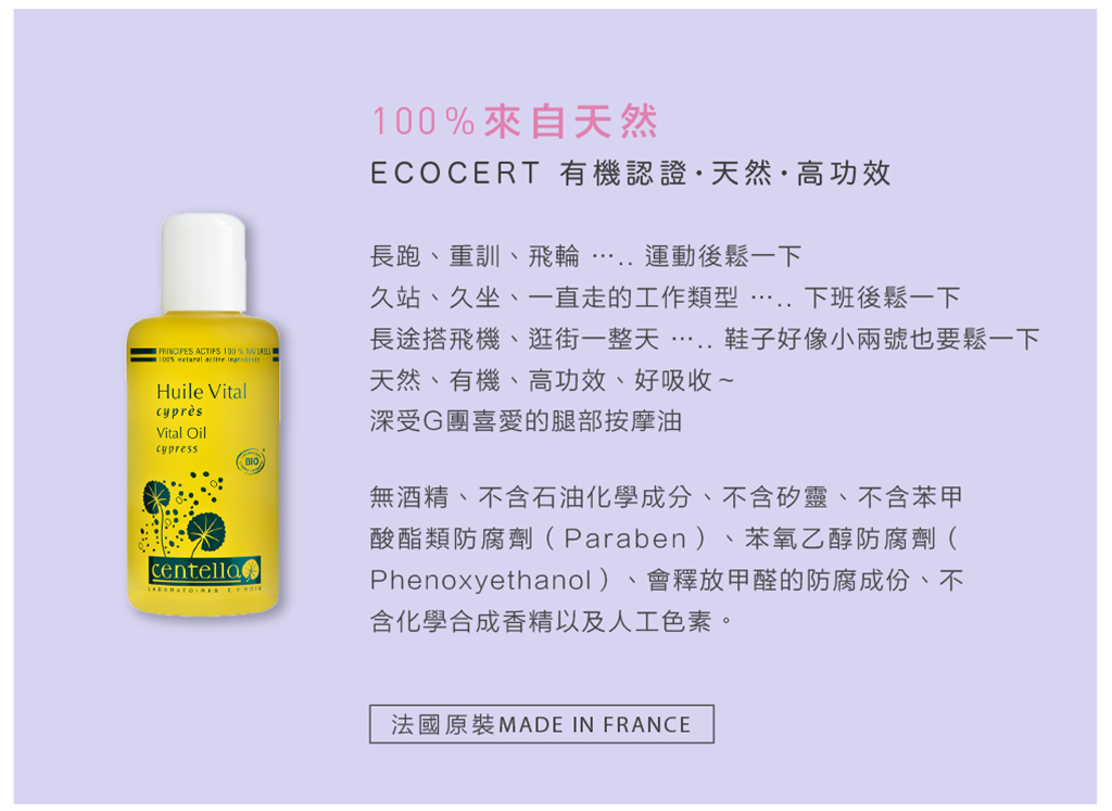 以柔細的植物油為基底,加上複方精油配方,及植物精粹,是您下班後、運動後寵愛下半身肌膚的最佳良伴。100% 無添加防腐成份,無化學合成色素及香精,無石化成份,以純天然草本來重拾腿部青春彈性及健康緊緻光采。